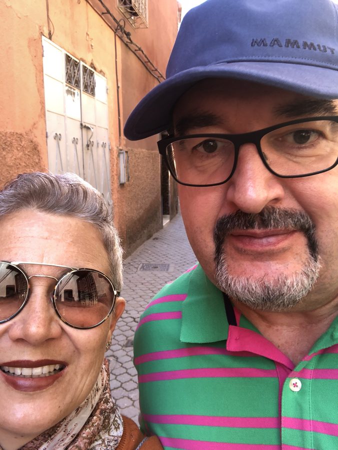 Das Bild zeigt meinen verstorbenen Göttergatten und mich im Jahr 2018. Anderthalb Jahre nach seiner vernichtenden Diagnose hat er sich gewünscht, einmal durch Marokko zu reisen. Ich habe damals alles daran gesetzt, ihm trotz starker Medikamente und Therapien diese Reise zu ermöglichen. Es waren für mich gefühlt 10 Tage Dauerstress, Angst und eine Ablehnung gegen dieses Land, wie ich es selten gegen ein Land hatte. Mir war dort alles zuviel. Die Menschen, die Farben, die Gerüche und zu allem Überfluss hat mich damals im Flugzeug auf dem Weg dorhin ein Virus erwischt, das mich husten und schneuzen liess, dass die Riadwände wackelten. Wir sind letztlich auch eher abgereist als geplant, weil ich es nicht mehr ausgehalten habe.